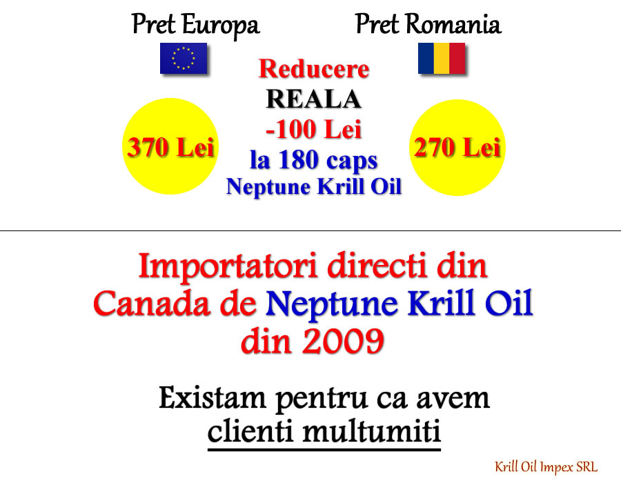 Scaderea Colesterolului Rau, scadere trigliceridelor si scaderea colesterolului Total cu Neptune Krill Oil Recomandat de Dr Oz. Comanda Krill Oil la pret de importator, cel mai mic pret pentru Uleiul de Krill, original si produs in Canada. Unicul extract de krill cu continut garantat de Omega 3-6-9, fosfolipide, colina, astaxantina, EPA si DHA. Site complet cu informatii despre Krill Oil administrare, Krill Oil pret, Krill Oil omega 369. Krill Oil in farmacii este livrat la fel ca si pentru ceilalti clienti. De unde cumpar Krill oil.